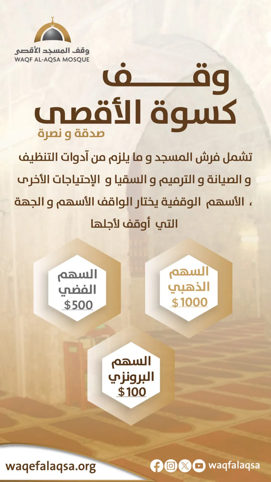 تشمل فرش المسجد وما يلزم من الصيانة والترميم والسقيا والاحتياجات الأخرى.